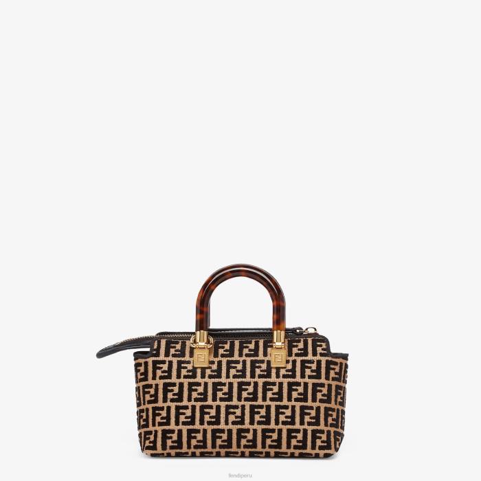 icónico por cierto mini bolso boston confeccionado en rafia en color natural con un motivo mini ff bordado en chenilla blanca con efecto tapiz para una combinación táctil única. Asas rígidas de plexiglás con efecto carey. cierre de cremallera.
