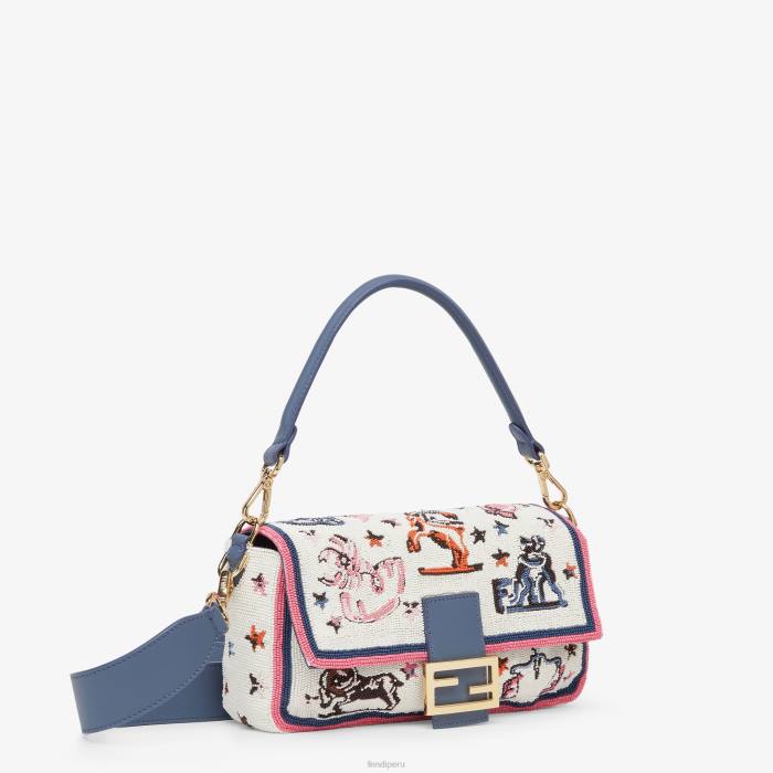 icónico bolso baguette mediano, exquisitamente elaborado a mano con cuentas multicolores y bordados dorados que crean el motivo astrológico de Fendi. adornado con un ribete de cuero azul y cierre ff.