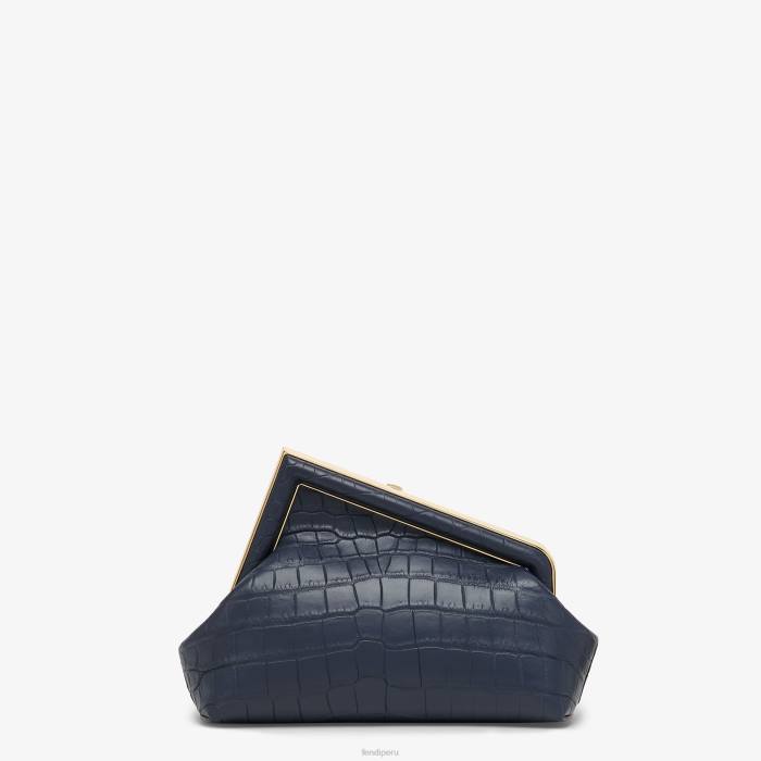 primer bolso fendi pequeño confeccionado en exquisita piel de cocodrilo azul oscuro con cierre f oversize de metal con una lujosa decoración en pavé de cristal.