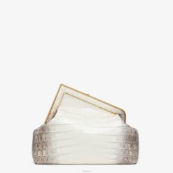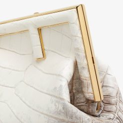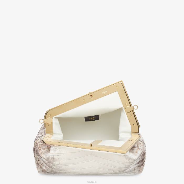 Primer bolso mediano de Fendi confeccionado en exquisita piel de cocodrilo natural, pintado de blanco. Cierre en F de metal de gran tamaño ribeteado en piel de cocodrilo tono sobre tono.