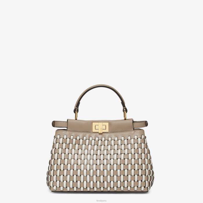 Icónico bolso peekaboo pequeño confeccionado en piel gris tórtola y blanca entrelazada a mano. decorado con el icónico cierre giratorio en ambos lados.
