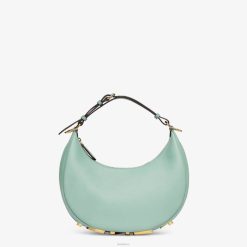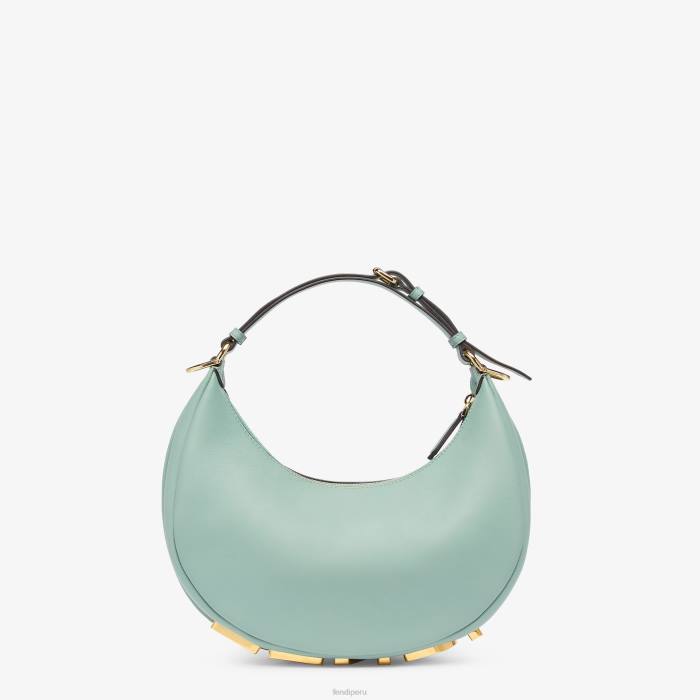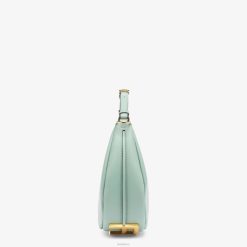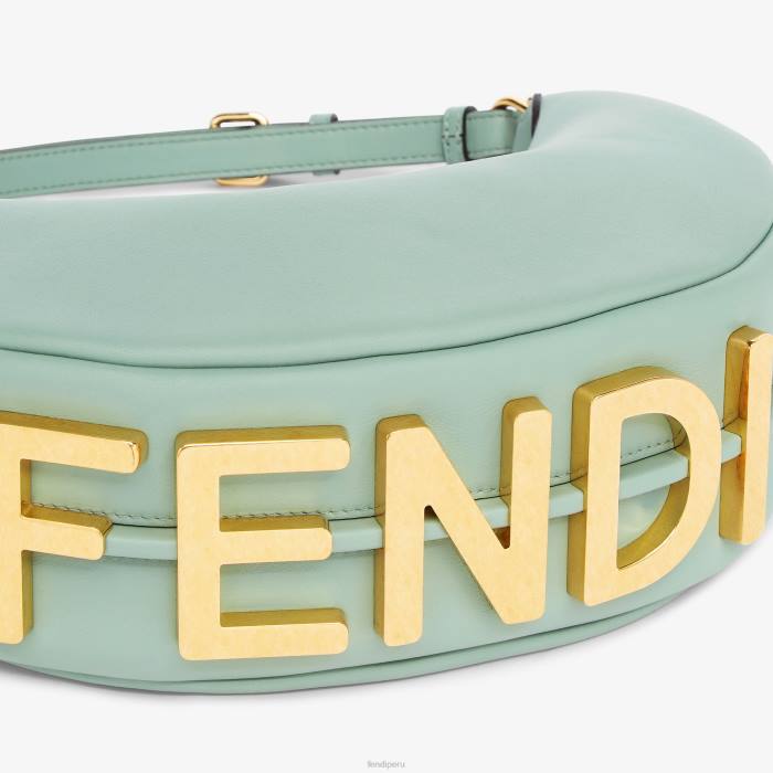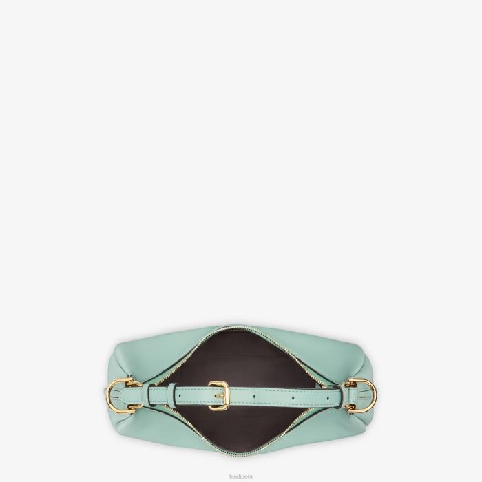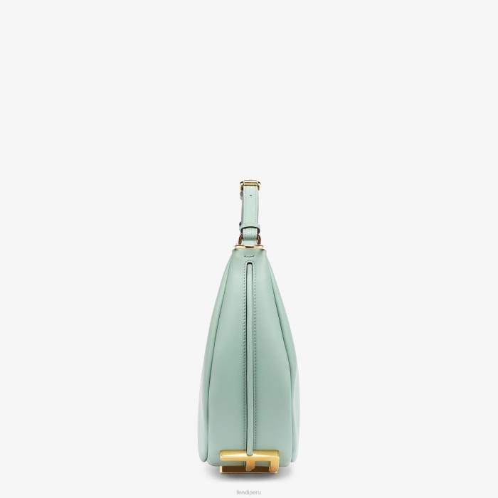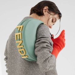Bolso hobo pequeño confeccionado en suave piel verde menta, decorado con letras fendi vintage de metal dorado visibles al llevar el bolso debajo del brazo.