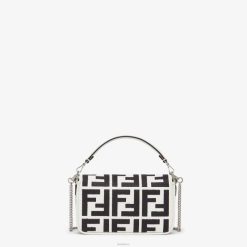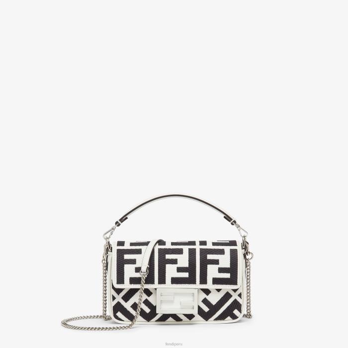 icónico bolso mini baguette, confeccionado en lona blanca con motivo ff negro bordado en relieve y cierre ff decorativo.