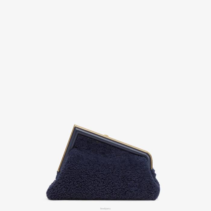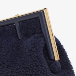 Primer bolso Fendi pequeño confeccionado en suave piel de oveja de color azul oscuro con cierre en forma de F de metal de gran tamaño ribeteado en piel de napa tono sobre tono.