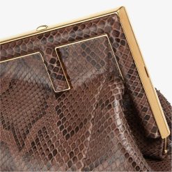Primer bolso pequeño de Fendi confeccionado en exquisita piel de pitón de color marrón oscuro con cierre de metal de gran tamaño en forma de F encuadernado en piel de pitón tono sobre tono.