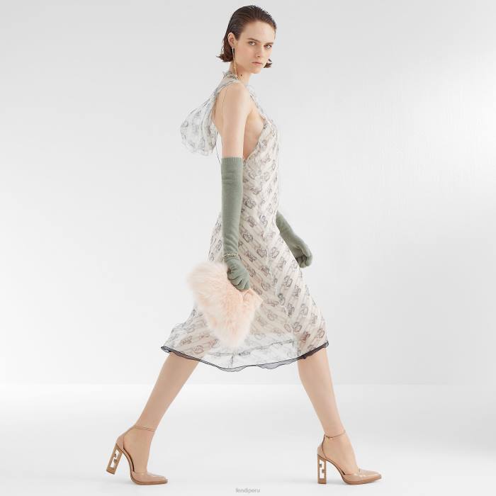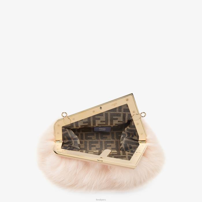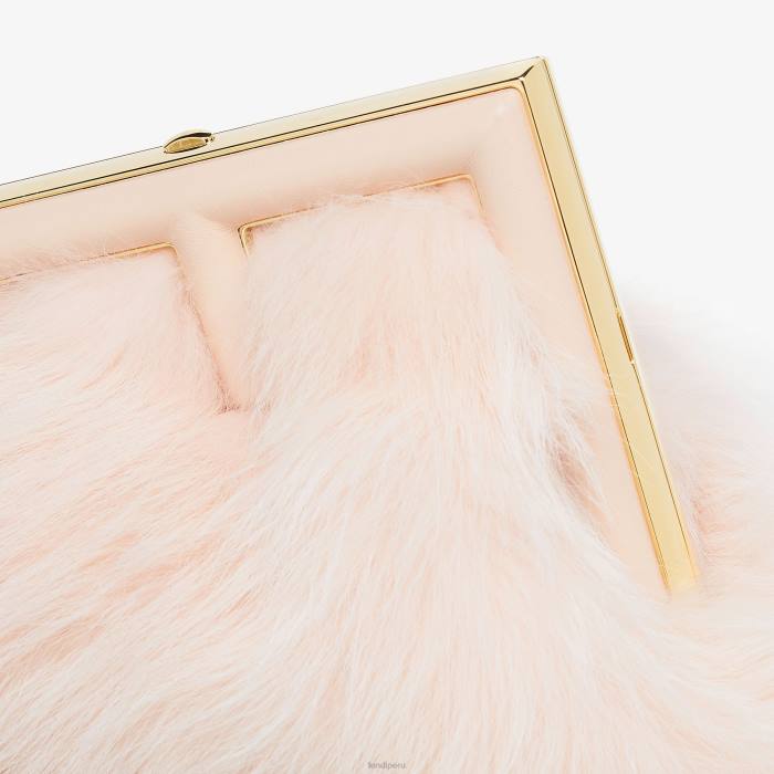 Primer bolso pequeño de Fendi confeccionado con parches de piel de zorro reciclada de color rosa pálido. Cierre de metal extragrande con forma de F, ribeteado en piel de napa tono sobre tono.