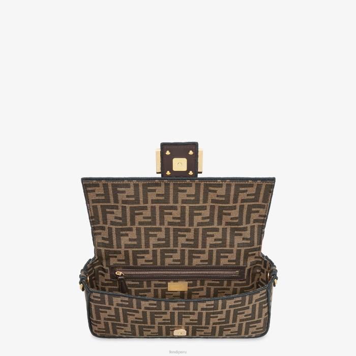 Icónico bolso baguette mediano confeccionado en tejido jacquard marrón con motivo ff, decorado con cierre ff y ribeteado con bordado negro.