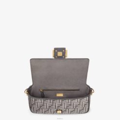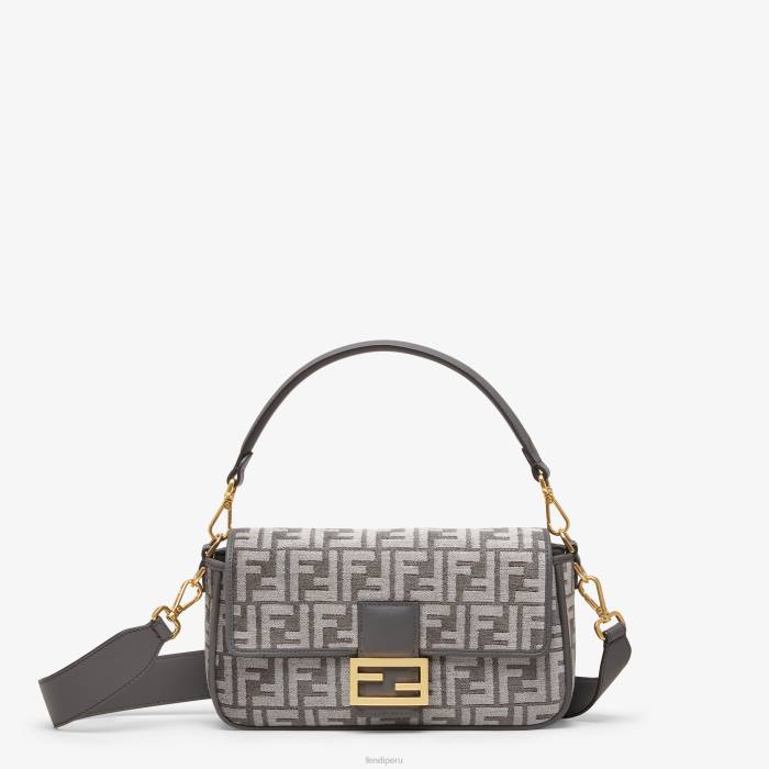 icónico bolso baguette mediano confeccionado en chenilla con motivo tapiz ff gris oscuro. acabado con detalles de cuero tono sobre tono y adornado con un cierre ff.
