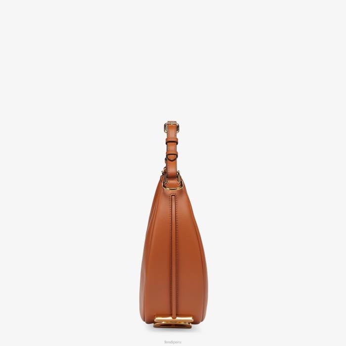 Bolso hobo pequeño confeccionado en suave cuero marrón, decorado con letras fendi vintage de metal dorado visibles al llevar el bolso debajo del brazo.