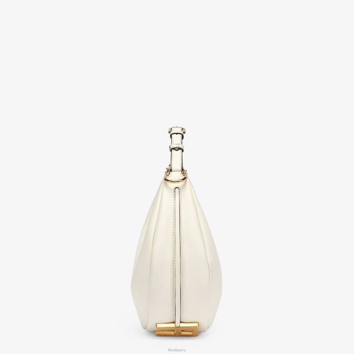 Bolso hobo pequeño confeccionado en suave cuero blanco, con letras fendi de metal dorado vintage visibles cuando se lleva el bolso debajo del brazo.