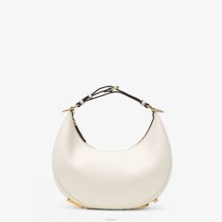 Bolso hobo pequeño confeccionado en suave cuero blanco, con letras fendi de metal dorado vintage visibles cuando se lleva el bolso debajo del brazo.