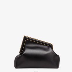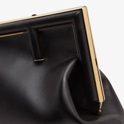 Primer bolso Fendi mediano confeccionado en suave napa negra con cierre en forma de F de metal de gran tamaño ribeteado en piel de napa tono sobre tono.