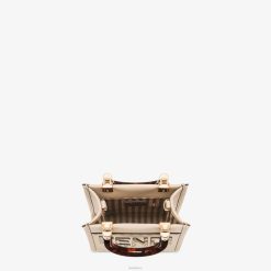 Bolso shopper mini Sunshine confeccionado en piel gris claro, con aplicación de la inscripción “fendi roma” en elaphe estampado efecto pitón y asas rígidas de plexiglás efecto carey.