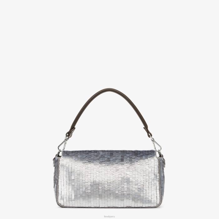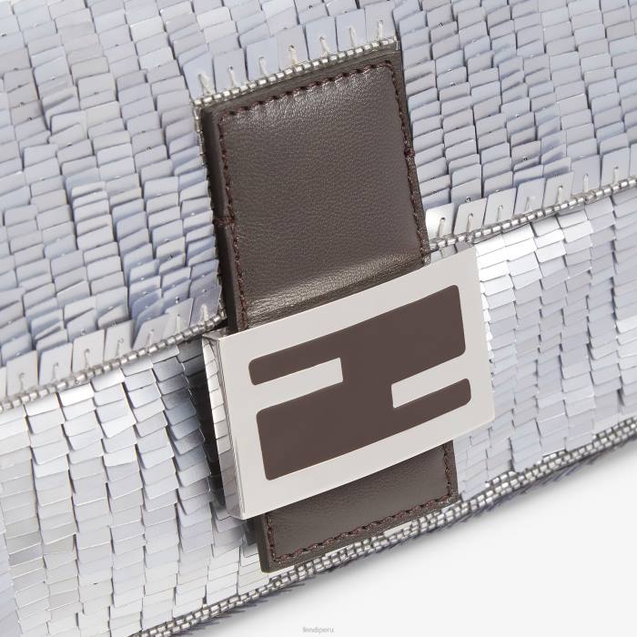 el baguette #7 está inspirado en el baguette con “lentejuelas de aluminio” de la temporada otoño/invierno. Colección 1999-2000. el bolso está meticulosamente bordado a mano con 12.600 lentejuelas cuadradas de color aluminio y rematado con detalles de cuero marrón.