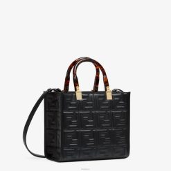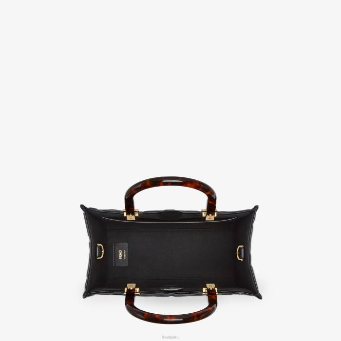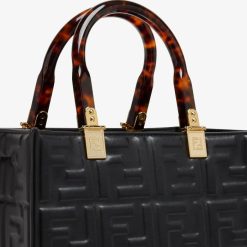 Bolso shopper pequeño Sunshine confeccionado en piel negra con motivo ff texturizado tridimensional en relieve y asas rígidas de plexiglás efecto carey.