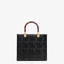 Bolso shopper pequeño Sunshine confeccionado en piel negra con motivo ff texturizado tridimensional en relieve y asas rígidas de plexiglás efecto carey.