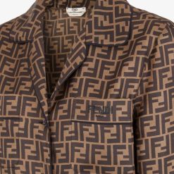 Camisa fluida de manga larga. Confección en sarga de seda marrón con estampado del motivo ff por toda la prenda. bolsillo en el pecho bordado con letras fendi negras.
