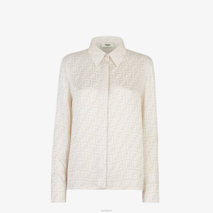 Camisa oversize y fluida de manga larga. cuello clásico en punta y dobladillo recto. cierre de botón oculto. Confección en crepé de seda color crema con motivo FF en jacquard por toda la prenda.