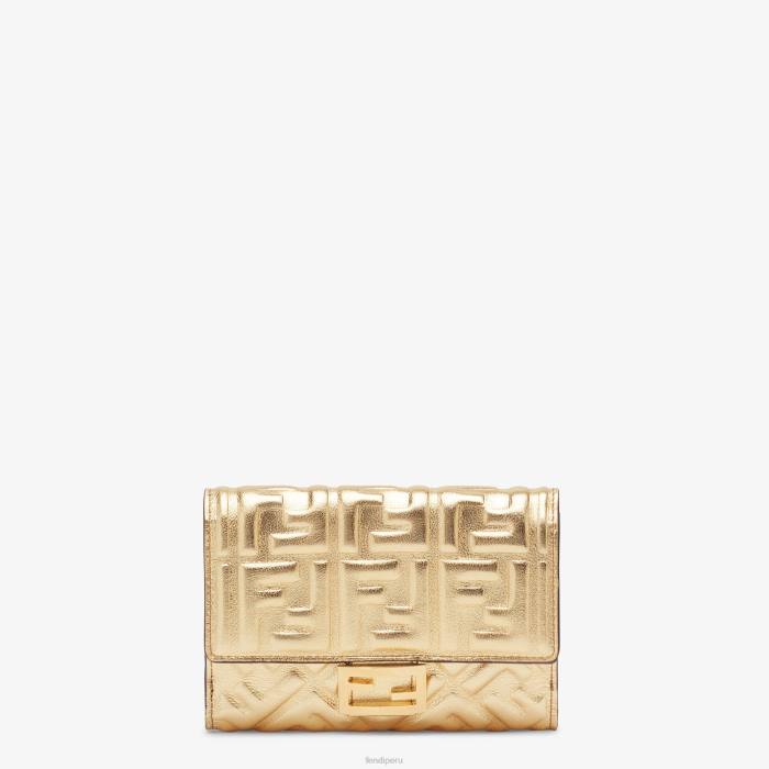 Cartera mediana baguette, con solapa y cierre con botón magnético ff. Interior organizado con dos bolsillos planos, un compartimento para billetes y ocho ranuras para tarjetas. compartimento trasero con icónico cierre giratorio y dos bolsillos con fuelle. Realizado en piel laminada dorada. rematado con motivo ff en relieve. artículos de metal con acabado dorado.