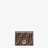 Cartera compacta f is fendi con bolsillo exterior y cierre de cremallera en tres lados. en su interior tiene dos bolsillos planos y ocho ranuras para tarjetas. cierre con botones a presión. fabricado en cuero negro. rematado con motivo ff grabado y pintado a mano. artículos de metal con acabado dorado.