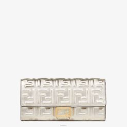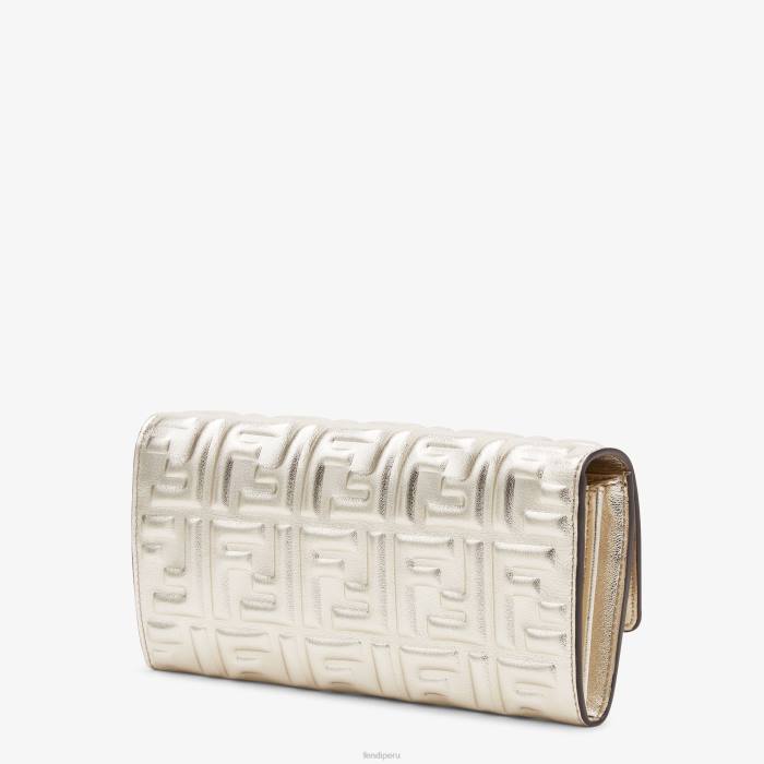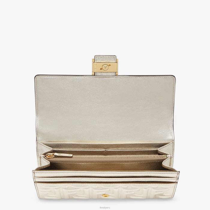 Cartera continental baguette con cierre a presión. espacioso y bien organizado, con dos bolsillos con fuelle, un bolsillo con cremallera, diez ranuras para tarjetas y bolsillos laterales planos. Confeccionado en piel metalizada color champagne. rematado con motivo ff en relieve. artículos de metal con acabado dorado.