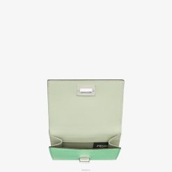 Cartera mediana peekaboo de tres pliegues, con compartimento para monedas con fuelle y cierre giratorio clásico. presenta un compartimento externo con cierre a presión, organizado con diez ranuras para tarjetas, dos bolsillos planos y dos compartimentos para billetes. Confección en piel cuoio romano verde. Forro de piel verde claro. Artículos metálicos con acabado en paladio.