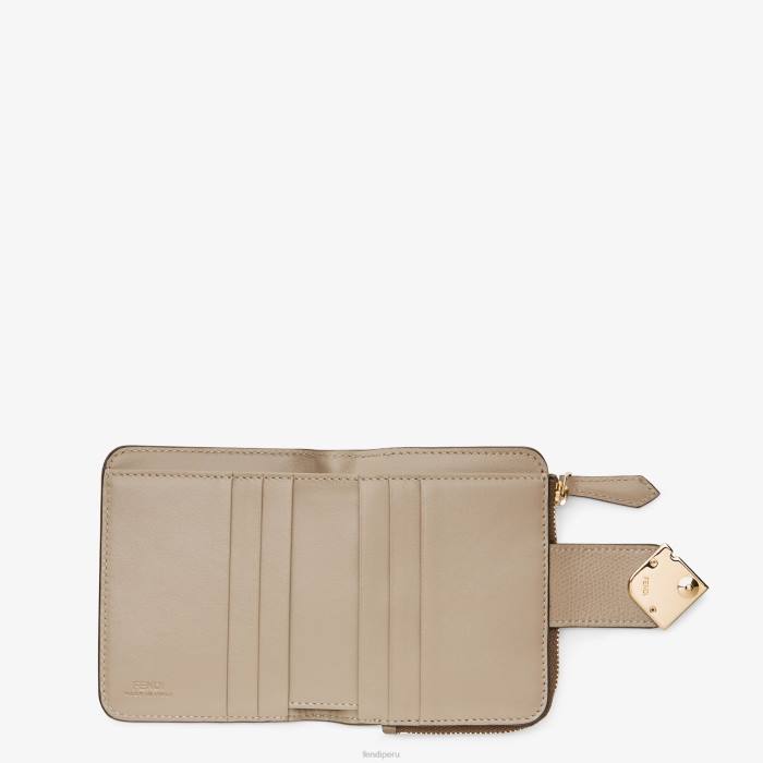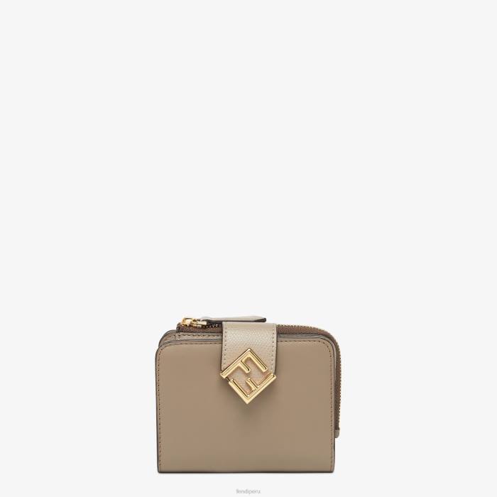 Cartera ff diamantes dividida en seis ranuras para tarjetas, un compartimento para billetes, un bolsillo monedero con cremallera y un bolsillo trasero. fabricado en cuero gris. Interior y detalles gris paloma. artículos de metal con acabado dorado.