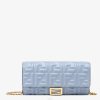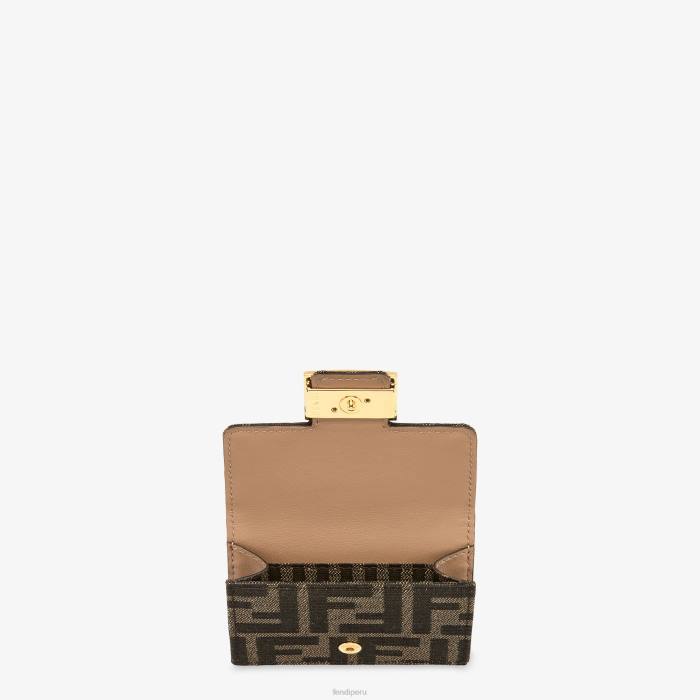 Cartera baguette compacta de tres pliegues con un gran compartimento interior para billetes, tres tarjeteros ocultos y un monedero exterior con cierre de botón de presión. Confección en tejido con el icónico motivo ff de jacquard marrón. Forro de piel marrón oscuro. artículos de metal con acabado dorado.