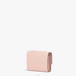 Cartera baguette compacta de tres pliegues con gran compartimento interno para billetes, tres tarjeteros ocultos y un monedero externo con cierre a presión. Confección en napa rosa con motivo ff texturizado en 3D. artículos de metal con acabado dorado.