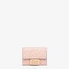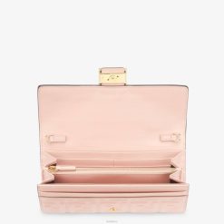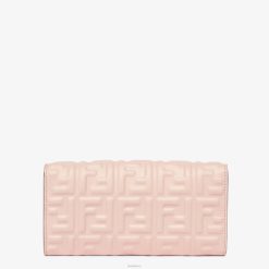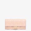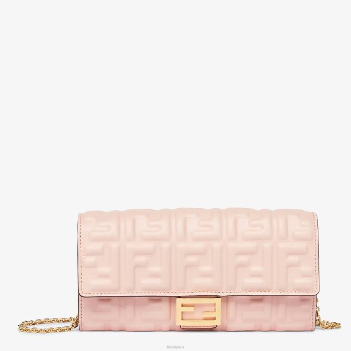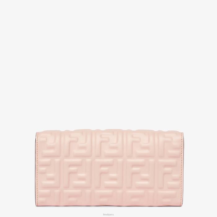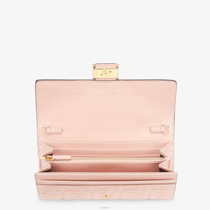 Cartera continental baguette con bandolera de cadena fina y desmontable. el interior se presenta como una cartera con dos compartimentos reforzados, un bolsillo con cremallera, dos bolsillos planos y diez ranuras para tarjetas. Confección en napa rosa con motivo ff grabado en relieve en 3D. artículos de metal con acabado dorado.