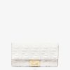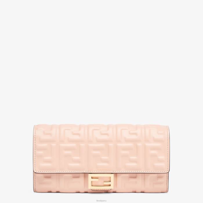 Cartera continental baguette con cierre a presión. espacioso y bien organizado, con dos bolsillos con fuelle, un bolsillo con cremallera, diez ranuras para tarjetas y bolsillos laterales planos. Confección en napa rosa con motivo ff texturizado en 3D. artículos de metal con acabado dorado.