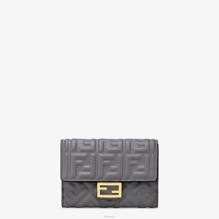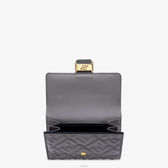 Cartera mediana baguette, con solapa y cierre con botón magnético ff. Interior organizado con dos bolsillos planos, un compartimento para billetes y ocho ranuras para tarjetas. compartimento trasero con dos bolsillos reforzados. Confección en napa gris con motivo ff grabado. artículos de metal con acabado dorado.