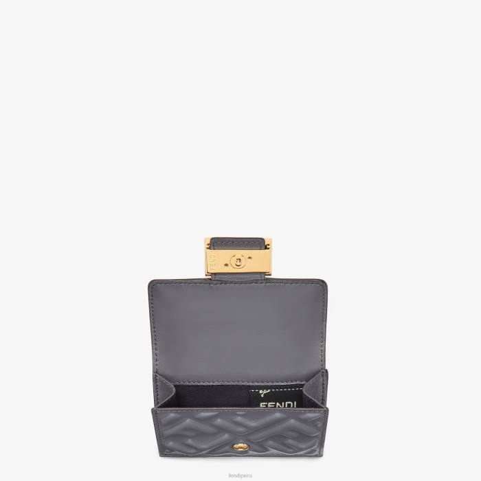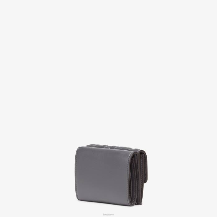 Cartera baguette compacta de tres pliegues con gran compartimento interno para billetes, tres tarjeteros ocultos y un monedero externo con cierre a presión. Confección en napa gris con motivo ff grabado. artículos de metal con acabado dorado.