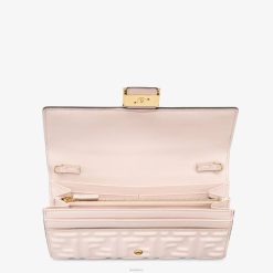 Cartera continental baguette con bandolera de cadena fina y desmontable. el interior se presenta como una cartera con dos compartimentos reforzados, un bolsillo con cremallera, dos bolsillos planos y diez ranuras para tarjetas. Confección en napa rosa con motivo ff grabado. artículos de metal con acabado dorado.