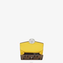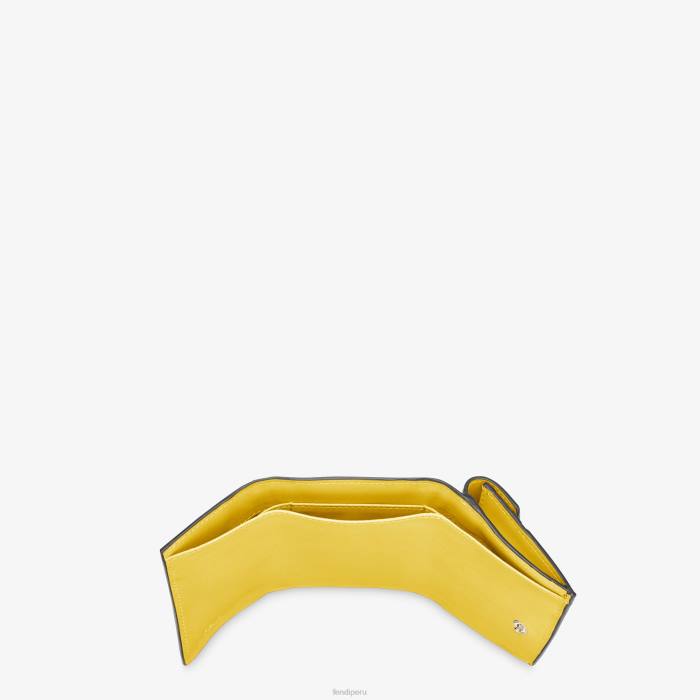 Cartera compacta f is fendi de tres pliegues, con gran compartimento interno para billetes, tres bolsillos tarjeteros ocultos y un monedero externo con cierre de botón de presión. Confección en piel crucero martillada de color amarillo. rematado con motivo ff grabado y pintado a mano. Artículos metálicos con acabado en paladio.