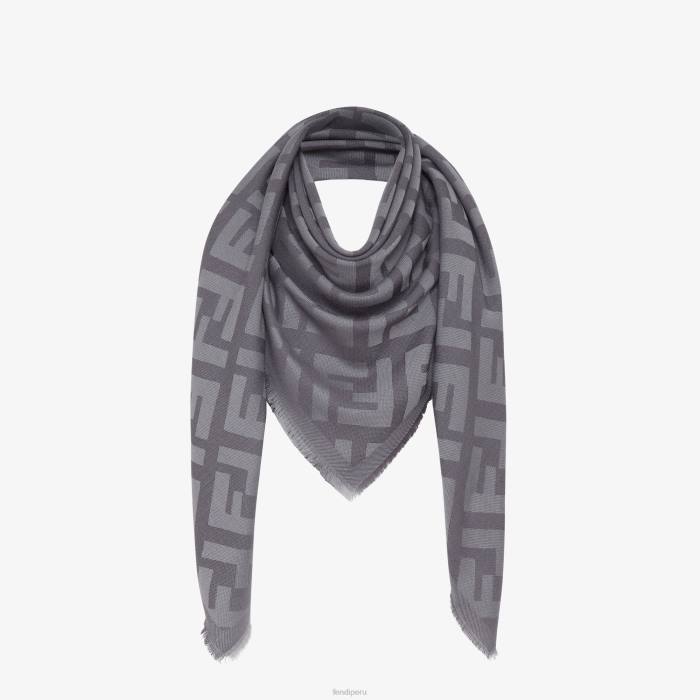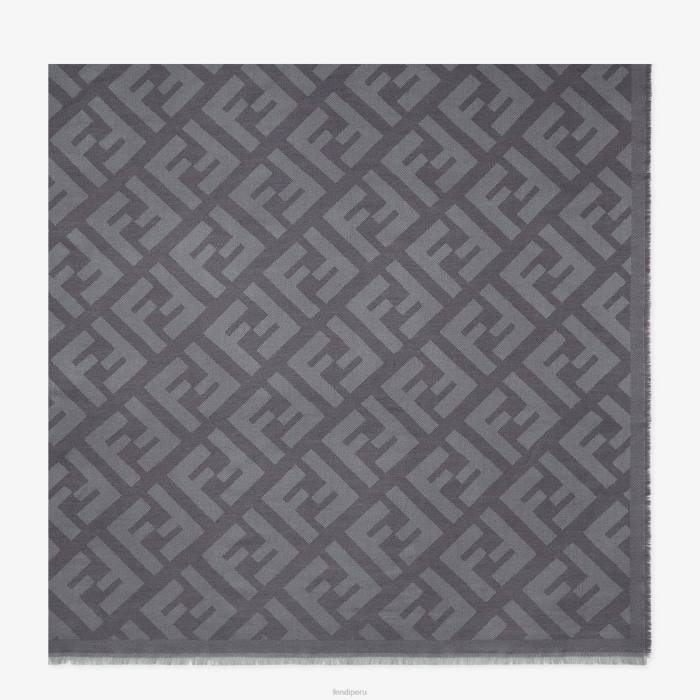 Mantón cuadrado grande confeccionado en lana y seda teñida en hilo, color gris asfalto y lana con estampado ff tono sobre tono. acabado con dobladillos deshilachados a mano.