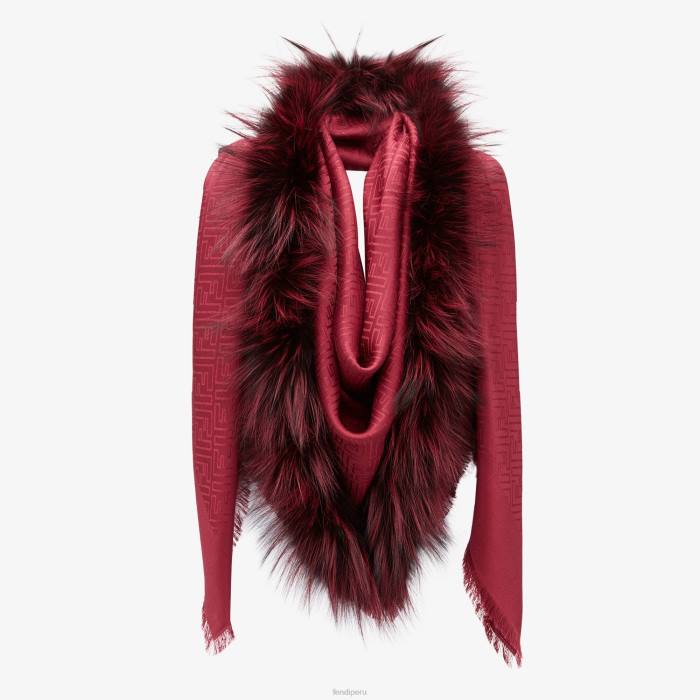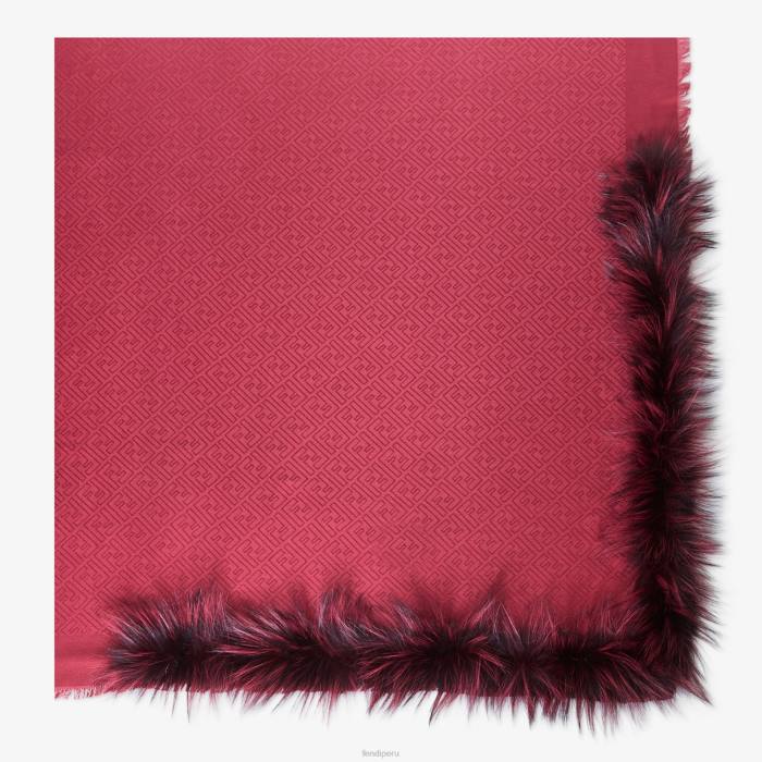 chal característico confeccionado con una suave mezcla de seda y lana de color rojo cereza. El tejido jacquard reproduce el icónico motivo de la doble f tono sobre tono. adornado con una esquina de piel de zorro. dobladillos con flecos hechos a mano.