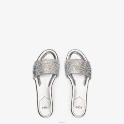 Chanclas de banda ancha en piel laminada con bordado de diamantes de imitación plateados por toda la superficie. decorado con bordados de cristales baguette que crean las letras fendi. Tacón de 10 mm.