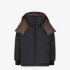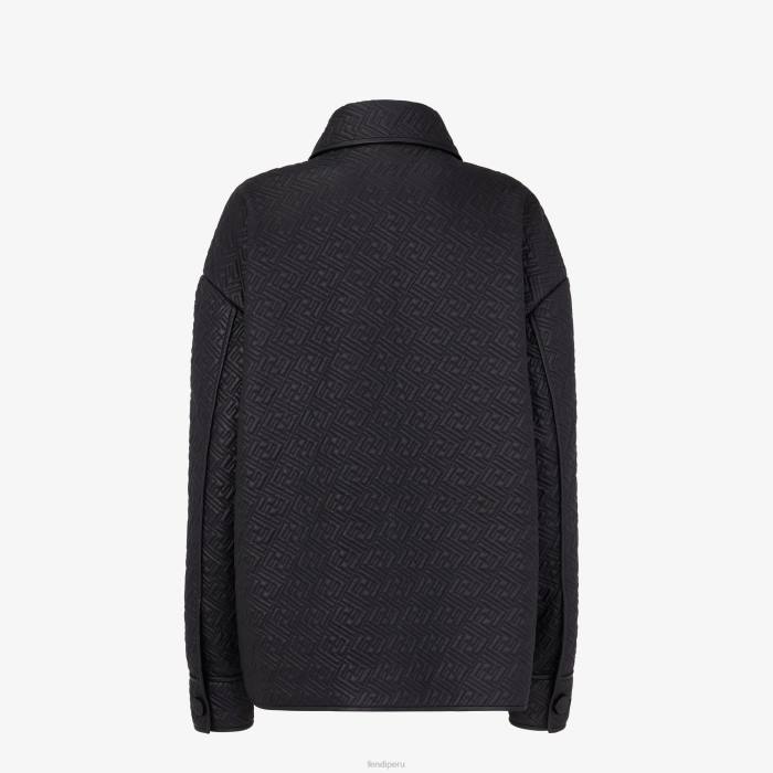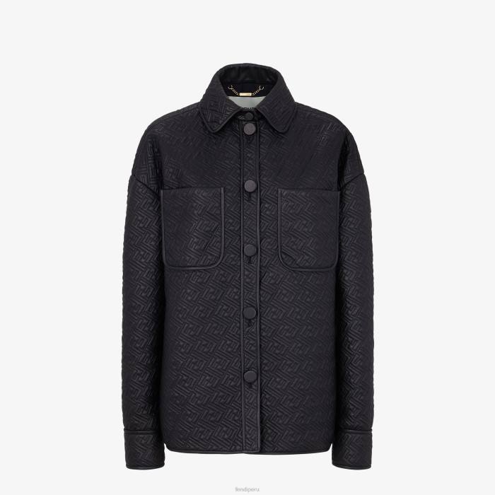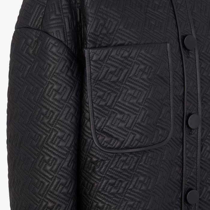 Chaqueta estilo camisa de botonadura sencilla con cuello puntiagudo y mangas escotadas. bolsillos de parche en el pecho. cerrado con botones personalizados de ff karligraphy. Confección en napa negra, con motivo ff en diagonal acolchado por toda la superficie.