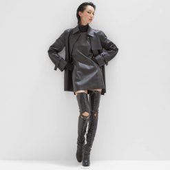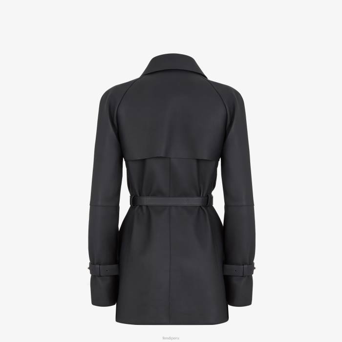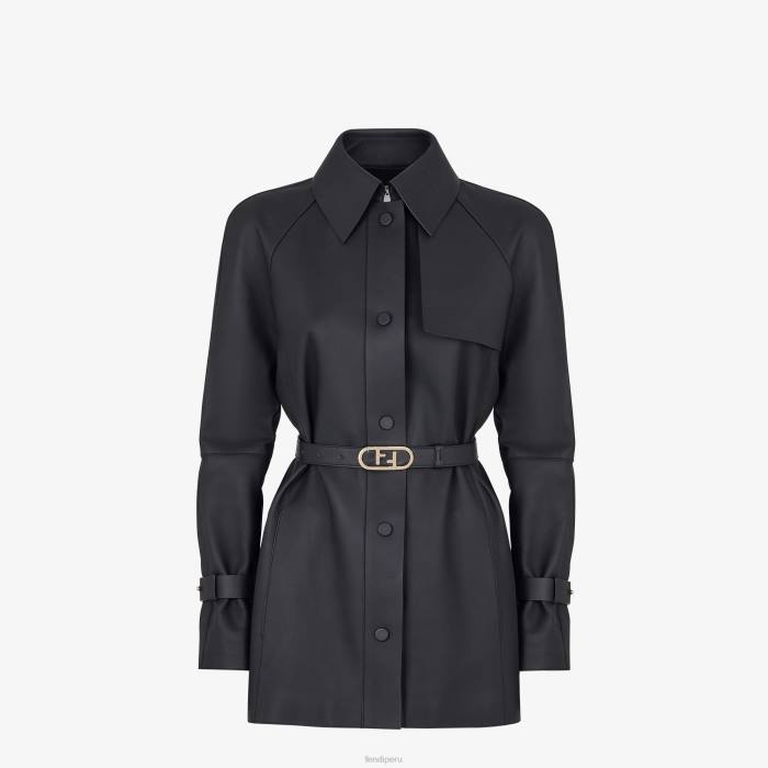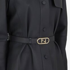 Gabardina de corte recto con cremallera recubierta y botones a presión. Tiene cuello camisero y tirantes ajustables en el puño. Realizado en piel encerada de color negro con acabado mate. cinturón a juego con hebilla fendi o’lock de metal dorado.
