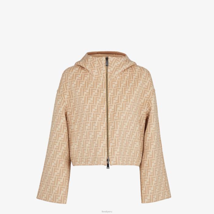 Chaqueta corta reversible con capucha, bolsillos de parche y mangas anchas y escotadas. Cierre de cremallera con doble cursor. confeccionado en tejido de lana beige de doble cara. Bolsillos de piel tono sobre tono. forro personalizado con motivo ff por toda la prenda.