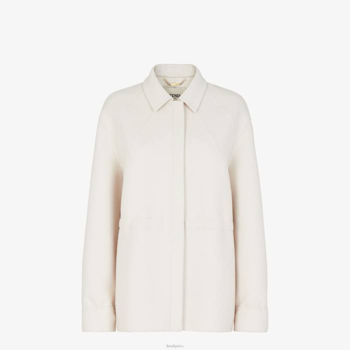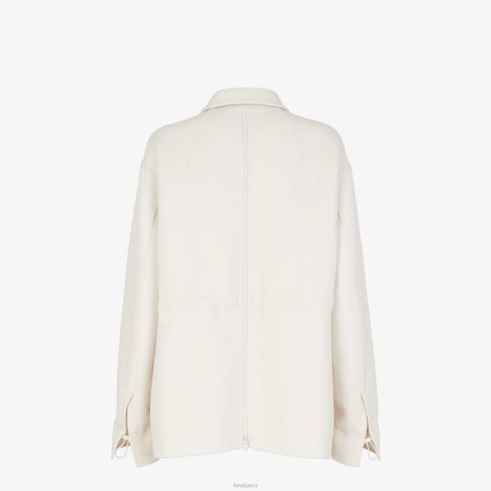 Chaqueta con cuello camisero y cintura ajustable con cordón interno. Mangas largas y escotadas con puños con cordón. cierre oculto. Confección en lana doble faz blanca con forro con motivo ff a juego.