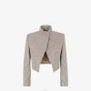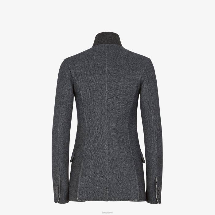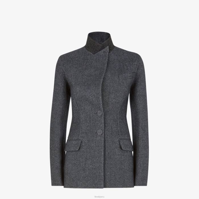 Chaqueta sastre de botonadura sencilla y cintura ajustada. cuello alto, bolsillo en el pecho y bolsillos con solapa. doble abertura en la espalda. Cierre con botones forrados. Confeccionado en lana de doble cara de color gris oscuro con tejido diagonal. cuello de lana gris en un tono ligeramente más oscuro.