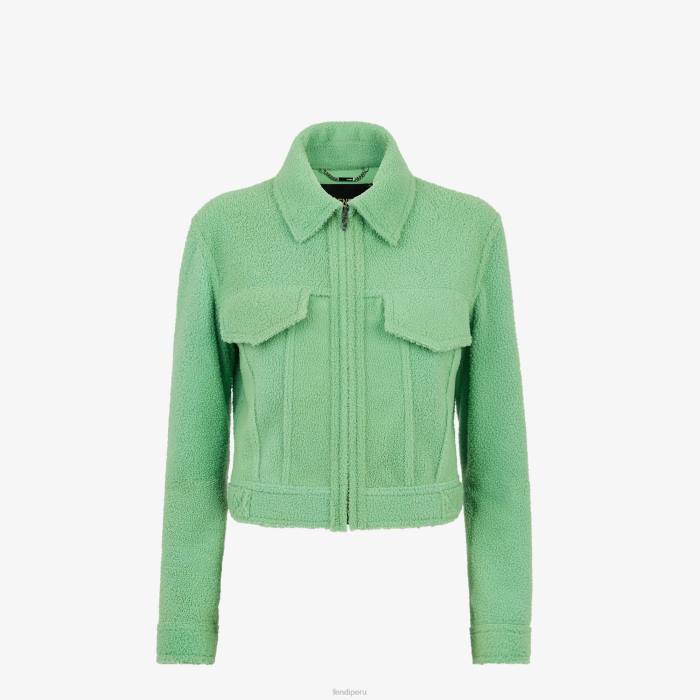 Chaqueta corta con cuello camisero y bolsillos en el pecho. Mangas largas ligeramente caídas. cierre de cremallera frontal con tirador de cremallera Fendi O’lock. Confección en borrego extrafino verde neón de textura suave y ligera.