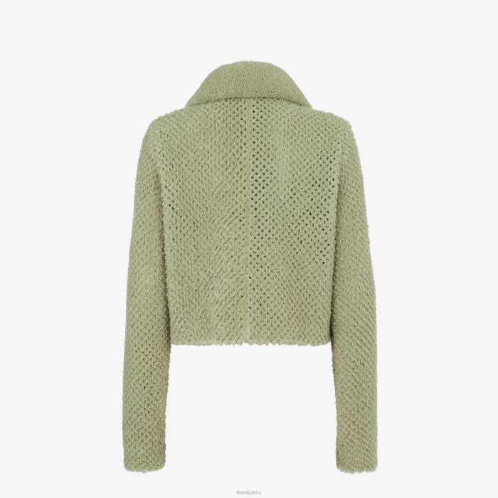 Chaqueta corta con cierre de cremallera. Cuello camisero y manga larga. Confección en suave borrego verde confeccionada con una textura especial perforada con efecto boucle que la hace ligera como una pluma.