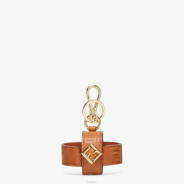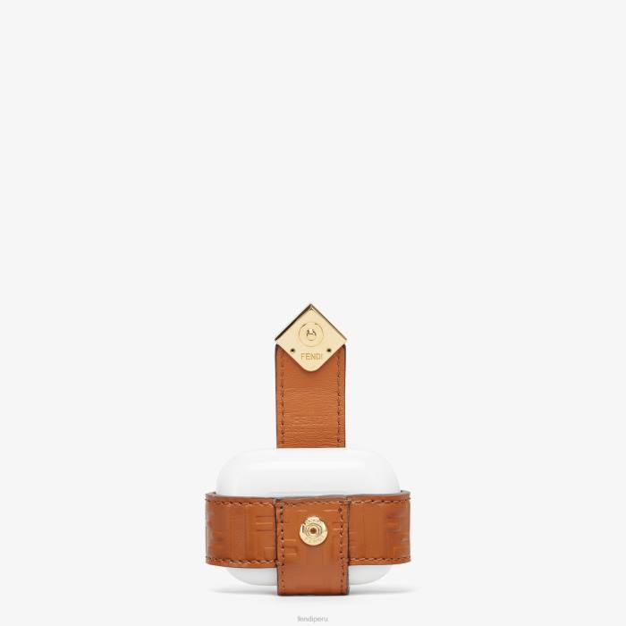 Funda para airpods pro con clip y anilla personalizados. Cierre diagonal ff con botón magnético. Confección en piel marrón con estampado mini ff en relieve. artículos de metal con acabado dorado.
