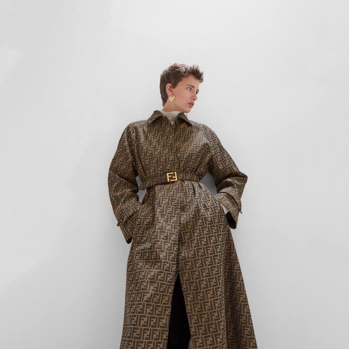 cinturón con presilla y hebilla icónica con tachuelas ff. Confección en tela con motivo ff en tonos marrones. Detalles de piel tono sobre tono. Accesorios de metal con acabado dorado vintage.