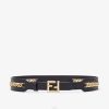Cinturón fino con trabilla y hebilla con tachuelas ff en diagonal. Confeccionado en piel marrón por un lado y lona beige con un bordado gráfico marrón por el otro. artículos de metal con acabado dorado.