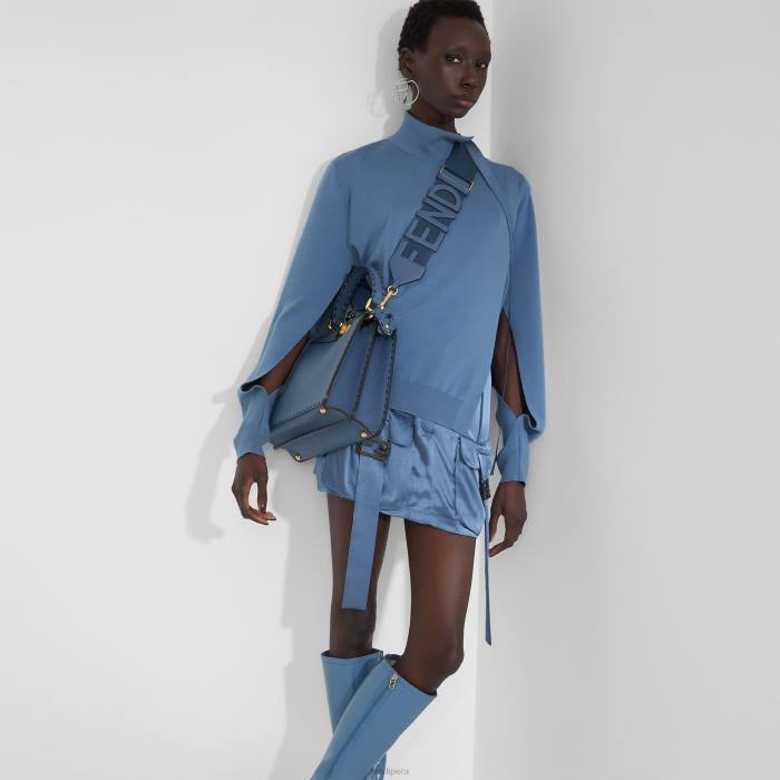 Bandolera larga ajustable con doble clip, para usar en combinación con cualquier bolso con ganchos. hecho de cinta de macramé azul. adornado con detalles y letras fendi en cuero cuoio romano ‘selleria’ tono sobre tono. artículos de metal con acabado dorado.