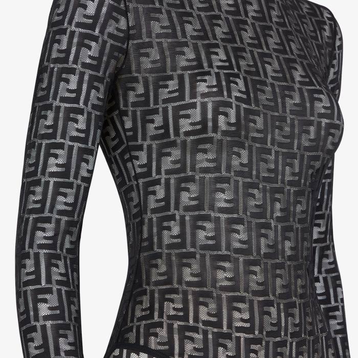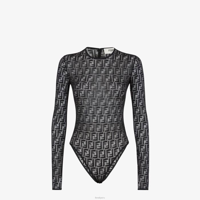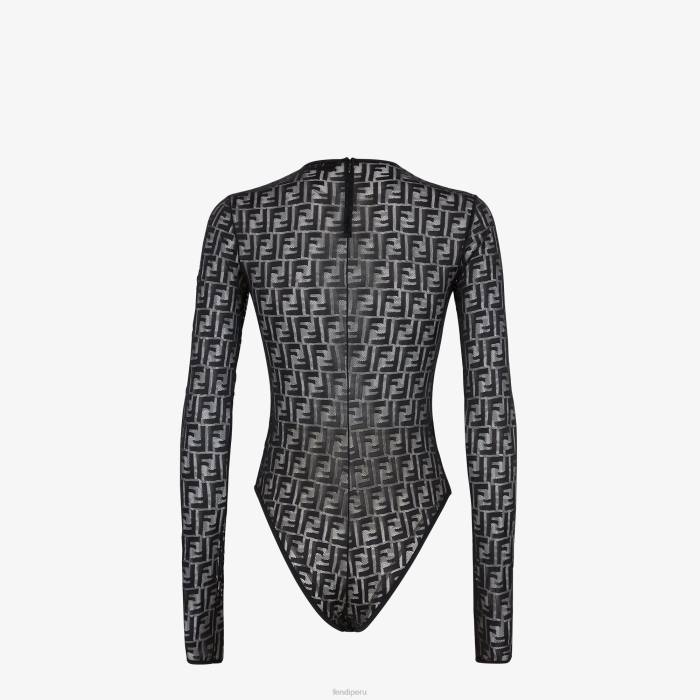 Body ajustado con cuello redondo y manga larga. Cierre de media cremallera en la espalda. Confección en encaje con motivo ff íntegramente en negro.